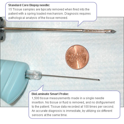 BioLuminate has achieved a breakthrough in the detection and treatment of cancer, with a miniaturized probe that accurately detects cancer in live tissue in real time, and improves patient treatment. There is no disfigurement and no tissue is removed. In past attempts of similar technologies, probes were not real time devices, and they were large in diameter. Consequently, they were not practical as a second level screening test (i.e. post mammography, ultrasound, PSA prostate cancer test, or other non invasive technique of lower accuracy), and did not offer the potential to improve treatment procedures.